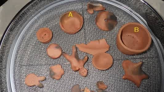 一部の土器は木炭に接触したようで黒くなっていましたが、ほとんどは黒くなっていませんでした。焼く前とほとんど同じ色のままでした。そして、焼けたかどうかを確認するため、土器を叩いてみると金属音のような音が響きました。特に、下画像のAとBは鉄琴のような素晴らしい音が出ました。今後はこれらの土器に釉を塗って完成しようとと思います。たかが焼く作業ですが、奥深いことを初めて知りました。