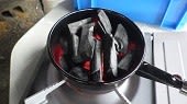 カセットコンロで炭に着火 ドライヤーで送風 七輪上部から排気